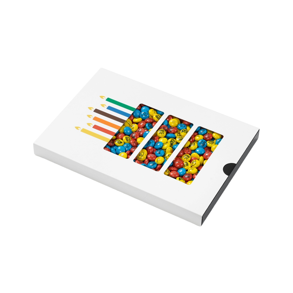 Keine Geburtstagsfeier ohne farbenfrohen Spaß. Da sind M&M’S® genau richtig. Unsere tolle Schatulle mit Sichtfenster in Tortenform gibt den Blick auf die enthaltenen personalisierten M&M’S® Schokolinsen frei. Viel Spaß beim Gestalten: Wählen Sie Farben der Schokolinsen, Nachricht, Foto oder Clipart und überraschen Sie mit einem einzigartigen Geburtstagskuchen. Eine spaßige Überraschung für Geburtstagskinder.