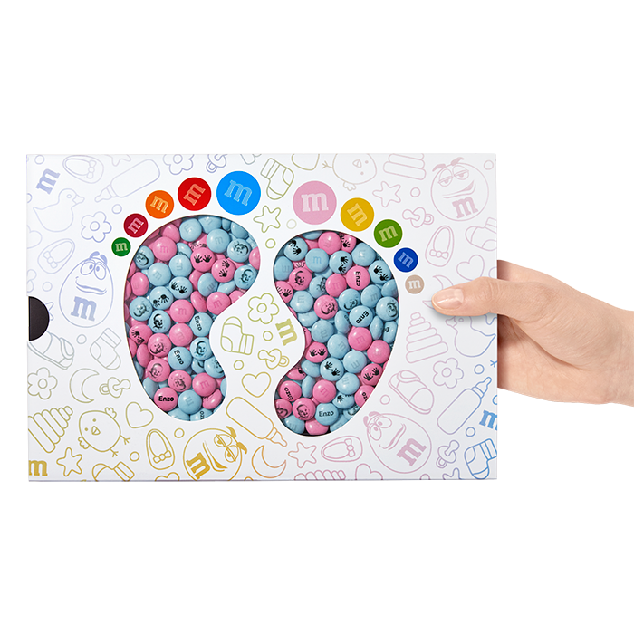 Die kleinen Babyfüße auf der Schatulle geben den Blick auf Ihre persönlichen M&M'S frei. Die Schatulle ist mit süßen Zeichnungen gefüllt, die jeden, der sie sieht, garantiert verzaubern werden. Die Schatulle lässt sich öffnen, indem man sie über den Rand schiebt. Zum Vorschein kommt ein transparentes Etui mit Ihren personalisierten M&M'S, das die Qualität unserer Produkte bewahrt.