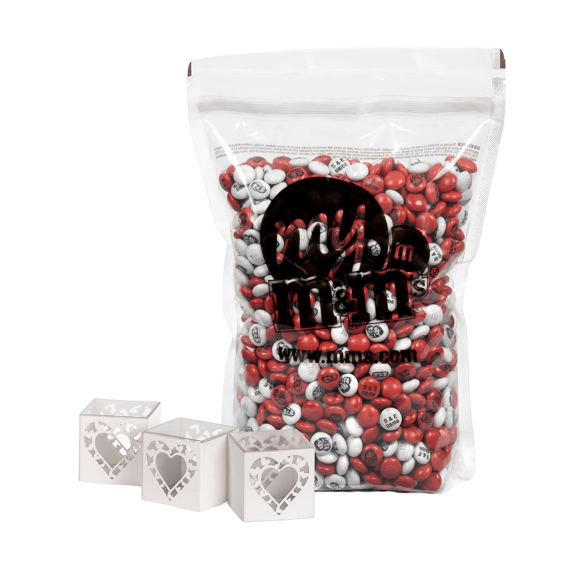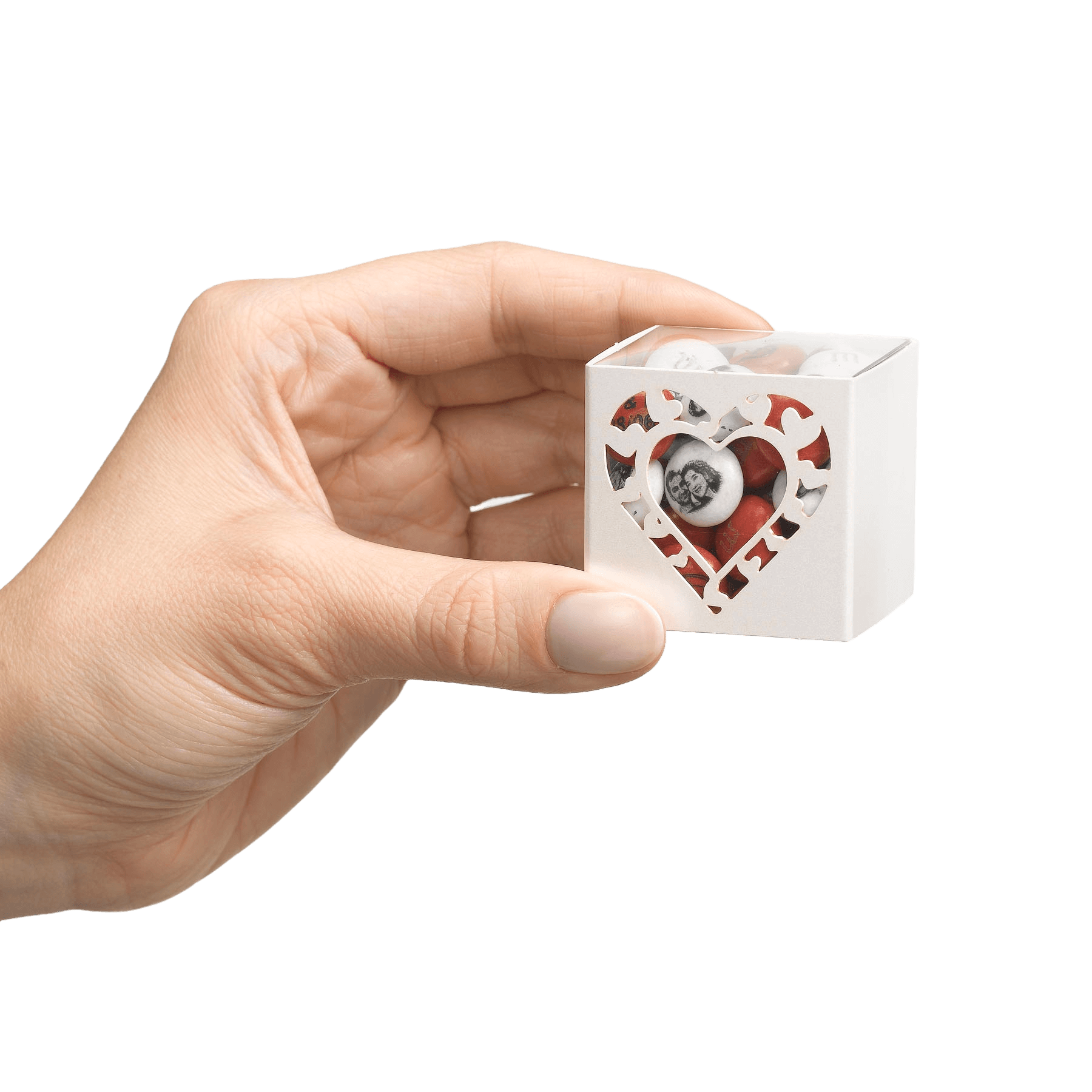 Kombinieren Sie Originalität und Eleganz mit diesen Würfeln und begeistern Sie Ihre Gäste! Füllen Sie diese, mit Herzchen hübsch durchbrochenen Würfel mit personalisierten M&M'S und veredeln Sie damit Ihre Dekoration. Es steht Ihnen frei, auf die perlmuttfarbene Pappe einen Vornamen oder eine süße Botschaft zu schreiben!