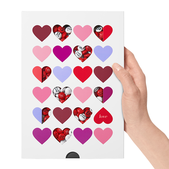 Lassen Sie sich von dieser hübschen "Herzen"-Schatulle mit personalisierten M&M'S begeistern! Diese elegante und trendige Schatulle ist mit vielen kleinen Herzen in verschiedenen Farben dekoriert. Personalisieren Sie die M&M'S mit einer Botschaft der Liebe oder Zuneigung Ihrer Wahl!