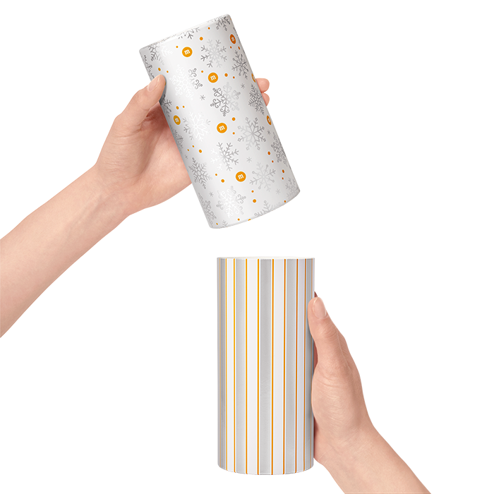 Make the M&M'S® chocolate candies the gift to get by personalizing them with up to 3 colors of your choice, out of 24. Then, add messages, holiday-themed clip-art, or a photo of your choice. It's all underneath a white, cool, snowflake tube, ready for their big reveal.