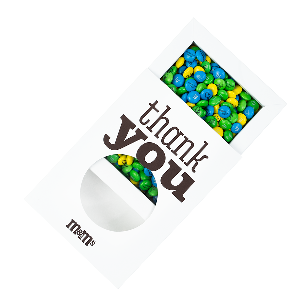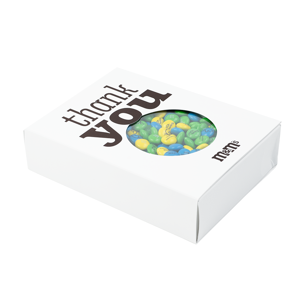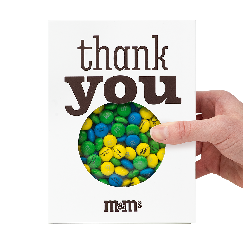 Gratitude with a fun attitude. The transparent window of this Thank You card reveals the personalized M&M’S® candies waiting inside. It’s a card and a personalized gift all in one. Good deeds deserve sweet treats.