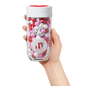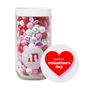 Clear jar filled with 12.7 oz (360 g) of personalized M&M'S®, about 13 servings of M&M’S chocolate candies. Personalize M&M’S® candies with colors, photos, messages, dates, names, or clip-art. Jar is topped with a lid featuring a red and pink heart design that says Happy Valentine's Day. Colorful, personalized Valentine’s Day gift for friends, family, teachers, and loved ones.