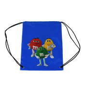 Royal blue backpack with black loop on top and black drawstrings that double as straps for easy carrying. Printed graphics of all 7 M&M’S® characters - 3 pictured on front and 4 on the back.