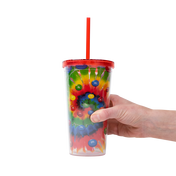 Tall tumbler features bright tie-dye design with colored lentils. Red lid and red straw included. Collectible keepsake gift for birthdays, teachers, coaches, thank you, or just because. Tumbler holds 20 oz.