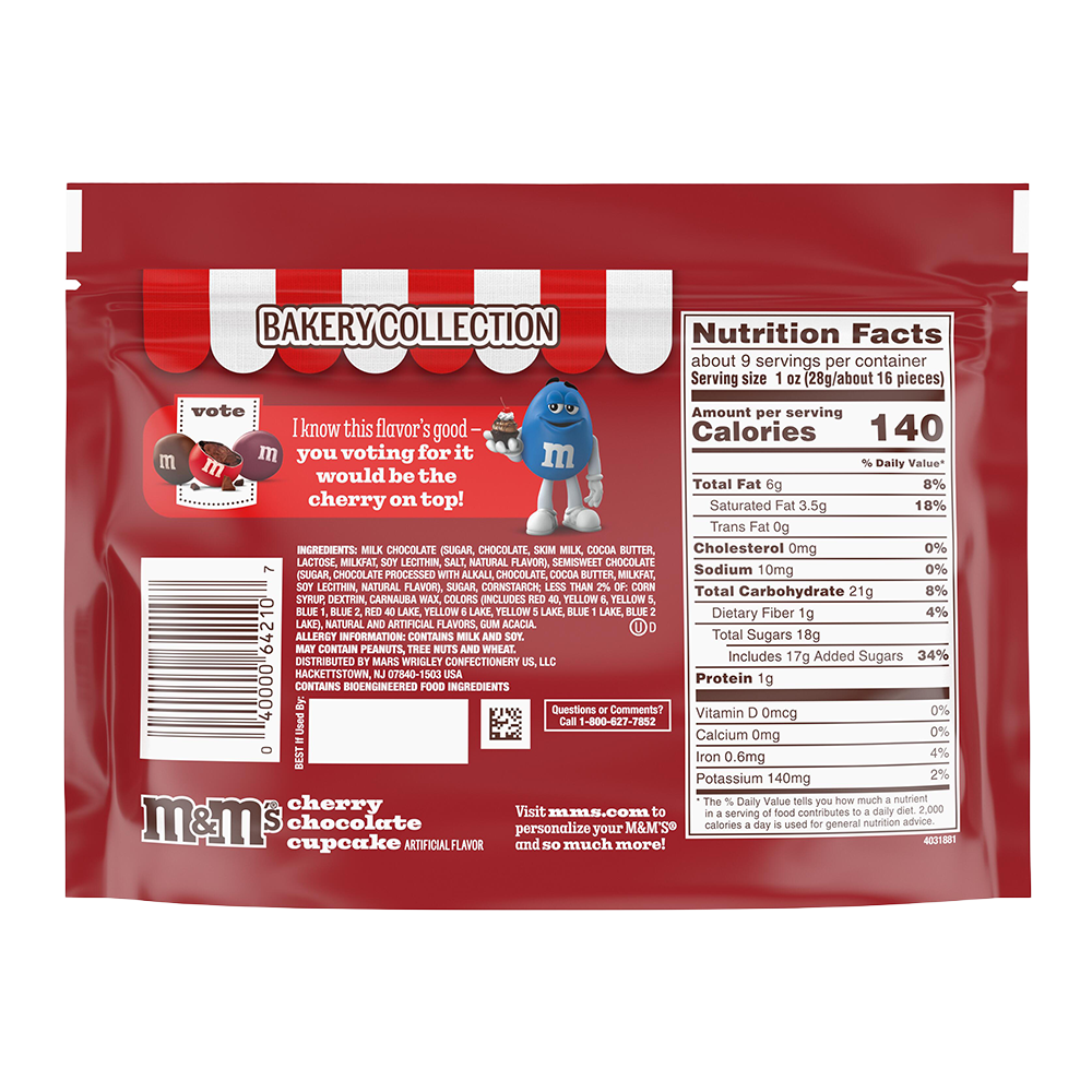 cherry chocolate cupcake: contains one (1) - 9 ounce sharing size resealable bag of M&M'S cherry chocolate cupcake candy, about 9 servings.