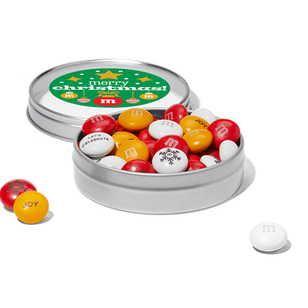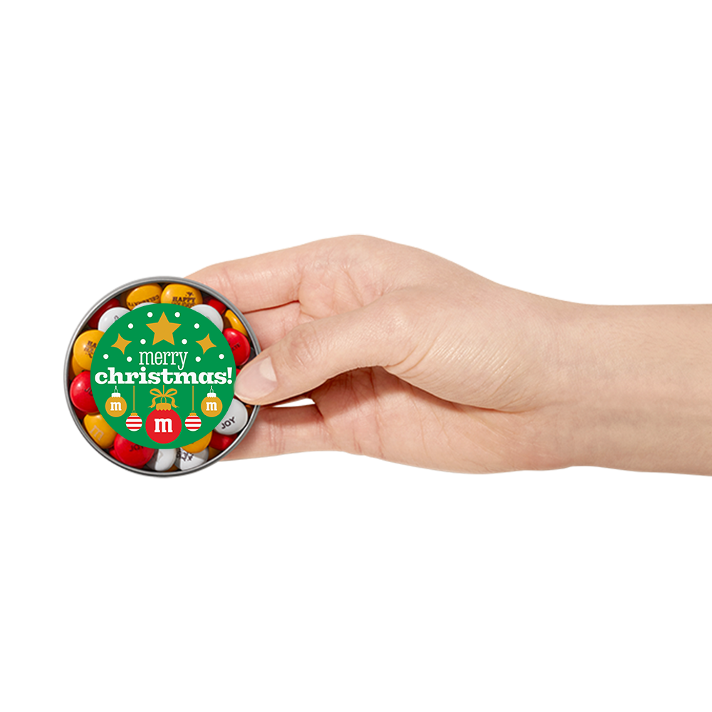 A holiday token to bring moments of joy at any time throughout the season. Our Christmas favor tins come with a festive green design that says “merry christmas” in the center surrounded by ornaments and stars. Create customized M&M’S® chocolate candies with colors, a photo, messages, or clip-art. These little sweet treats are great for your guests at your holiday celebration or for an additional stocking stuffer.