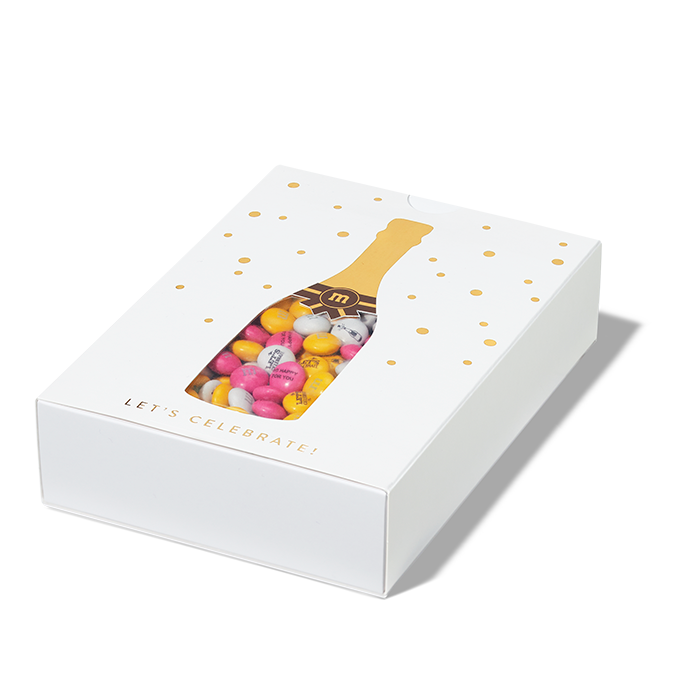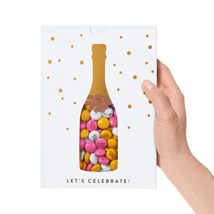 M&M’S® chocolate candies peeking through a bottle cutout, personalized to sweet perfection… we’ll toast to that!