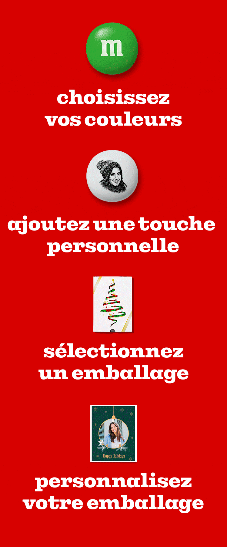 Créer un mélange de M&M'S personnalisés est aussi facile qu’amusant ! Faites votre choix parmi notre palette de 15 couleurs, ajoutez ensuite des photos, des cliparts et du texte pour rendre vos chocolats uniques.