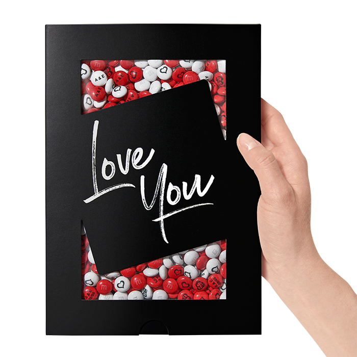 Un écrin au message romantique renfermant des M&M'S personnalisés avec votre création unique pour un cadeau tout en délicatesse qui ravira votre moitié.