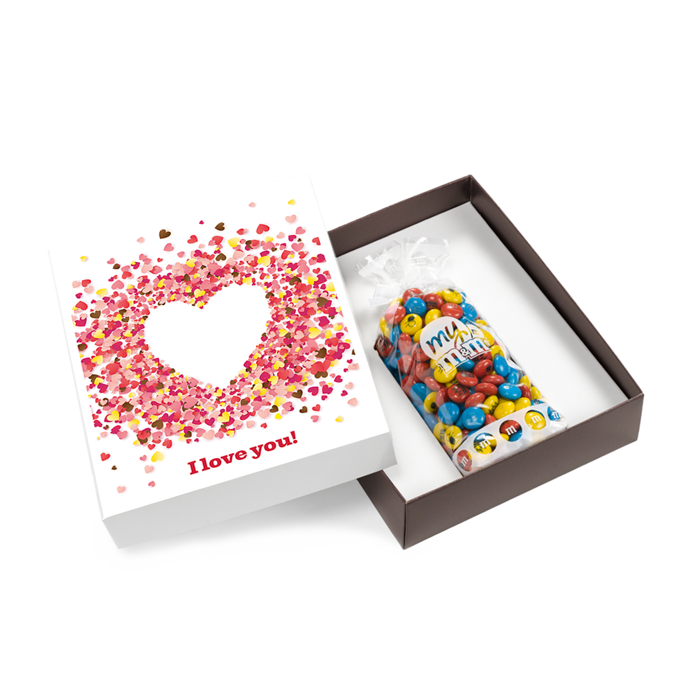 Ce coffret aux jolies couleurs s'ouvre facilement par le dessus et laisse apparaître un joli sachet emballé d'un ruban et rempli de M&M'S personnalisés. Créez un assortiment qui correspond parfaitement à votre style ou à votre évènement en personnalisant les couleurs, photo, textes et cliparts de vos M&M'S !