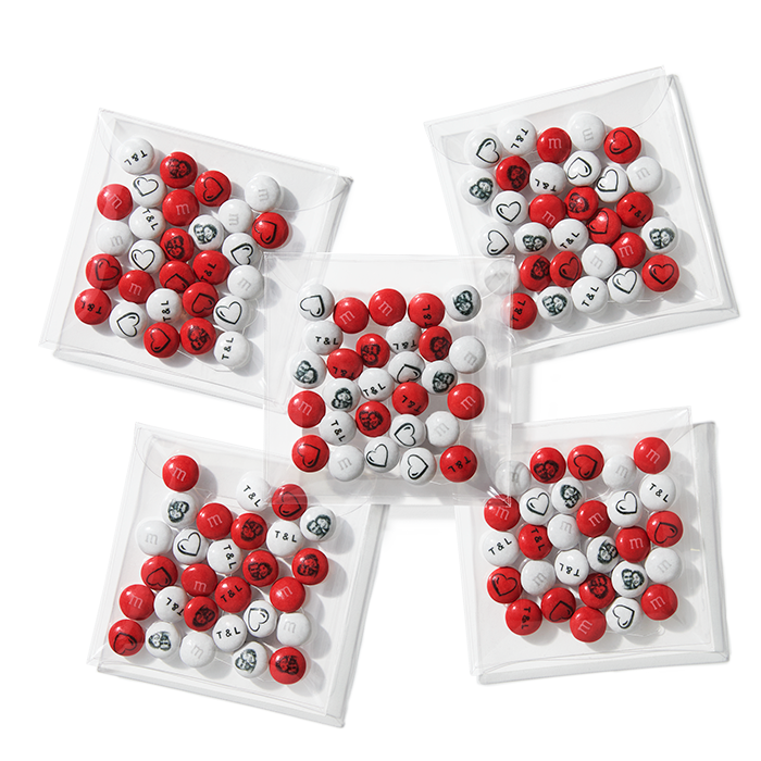 grazie alla loro trasparenza, questi graziosi astucci rivelano i tuoi M&M'S personalizzati ai tuoi ospiti. Non esitare ad arricchirli di accessori per valorizzarli. I singoli astucci arrivano già confezionati a casa tua: facilissimo!