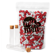 Dit pakket bevat een zak van 1,5 kg gepersonaliseerde M&M’S en 40 glazen buisjes die met ongeveer 35 g M&M’S kunnen worden gevuld.