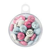 extra personalisatieoptiesVerpakking en gepersonaliseerde M&M'S worden verkocht zonder stickers, labels en accessoires. Je kunt finishing touches met gepersonaliseerde berichten op stickers of labels toevoegen en lintjes of hangertjes kiezen in het accessoires gedeelte.