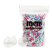 Dit pakket bevat een zak van 1,5 kg gepersonaliseerde M&M’S en 30 plastic ballen om zelf te vullen, waar ongeveer 50 g M&M’S in passen.